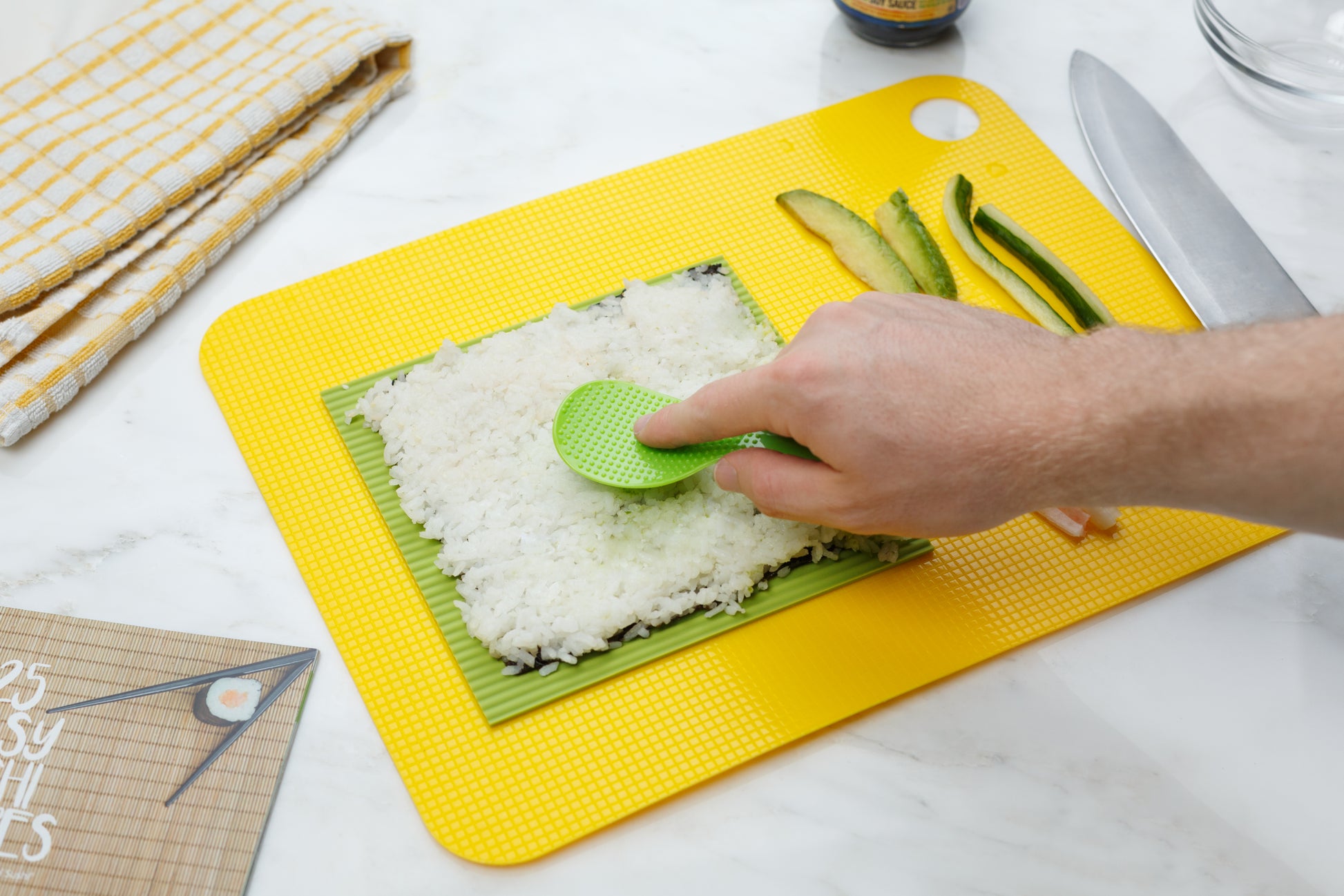 • The Set for The Perfect Sushi Roll - The sushi rolling kit includes a 7x7 inch silicone mat, rice paddle, sushi roll slicer, and a FREE recipe book and ideas.